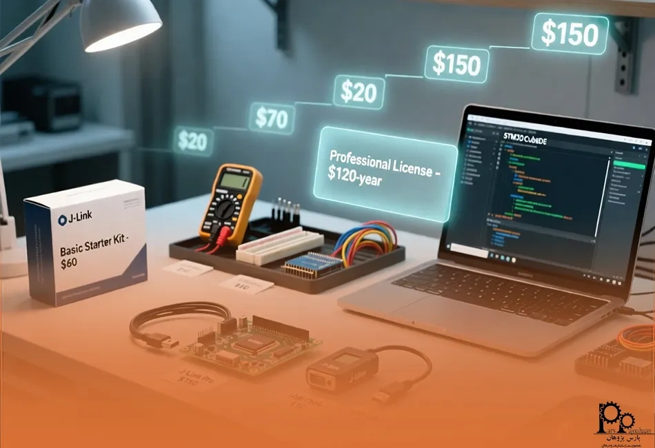تجهیزات لازم برای کار با میکروکنترلر ARM بسته به برند، کیفیت و نوع پروژه میتوانند از نظر هزینه متفاوت باشند. یک برد توسعه ساده معمولاً بین ۲۰ تا ۵۰ دلار قیمت دارد، در حالی که بردهای حرفهایتر با قابلیتهای بیشتر تا ۱۰۰ دلار یا بیشتر میرسند. کابل USB و پروگرامرهای پایهای معمولاً ۵ تا ۳۰ دلار هزینه دارند، اما پروگرامرهای پیشرفته مانند J-Link یا ST-Link ممکن است تا ۱۵۰ دلار هم قیمت داشته باشند. نرمافزارهای IDE معمولاً رایگان یا با نسخههای محدود عرضه میشوند، اما نسخههای حرفهای ممکن است هزینه اشتراک سالانه داشته باشند.
