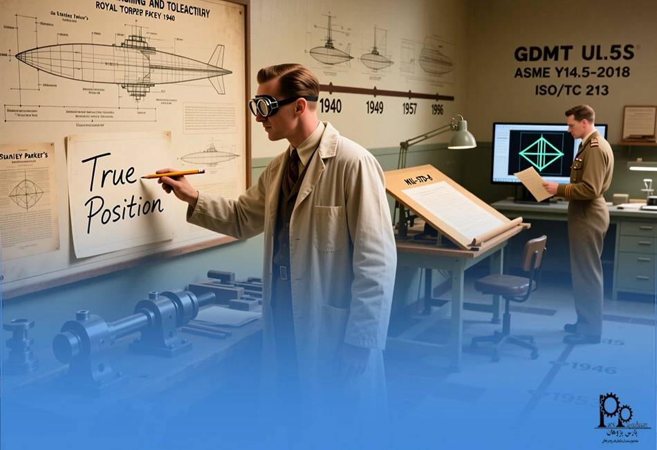 پیدایش دهه ۱۹۴۰: همانطور که اشاره کردیم، ریشههای GD&T به کار فردی به نام استنلی پارکر در کارخانه سلطنتی اژدر در اسکاتلند در آستانه جنگ جهانی دوم بازمیگردد. او متوجه شد که بسیاری از قطعاتی که از نظر عملکردی قابل قبول بودند، به دلیل خارج بودن از تلرانسهای مختصاتی رد میشدند. پارکر مفهوم موقعیت واقعی (True Position) را توسعه داد تا تلرانسها را بر اساس عملکرد قطعه تعریف کند. او اولین اثر خود را در سال ۱۹۴۰ منتشر کرد.
